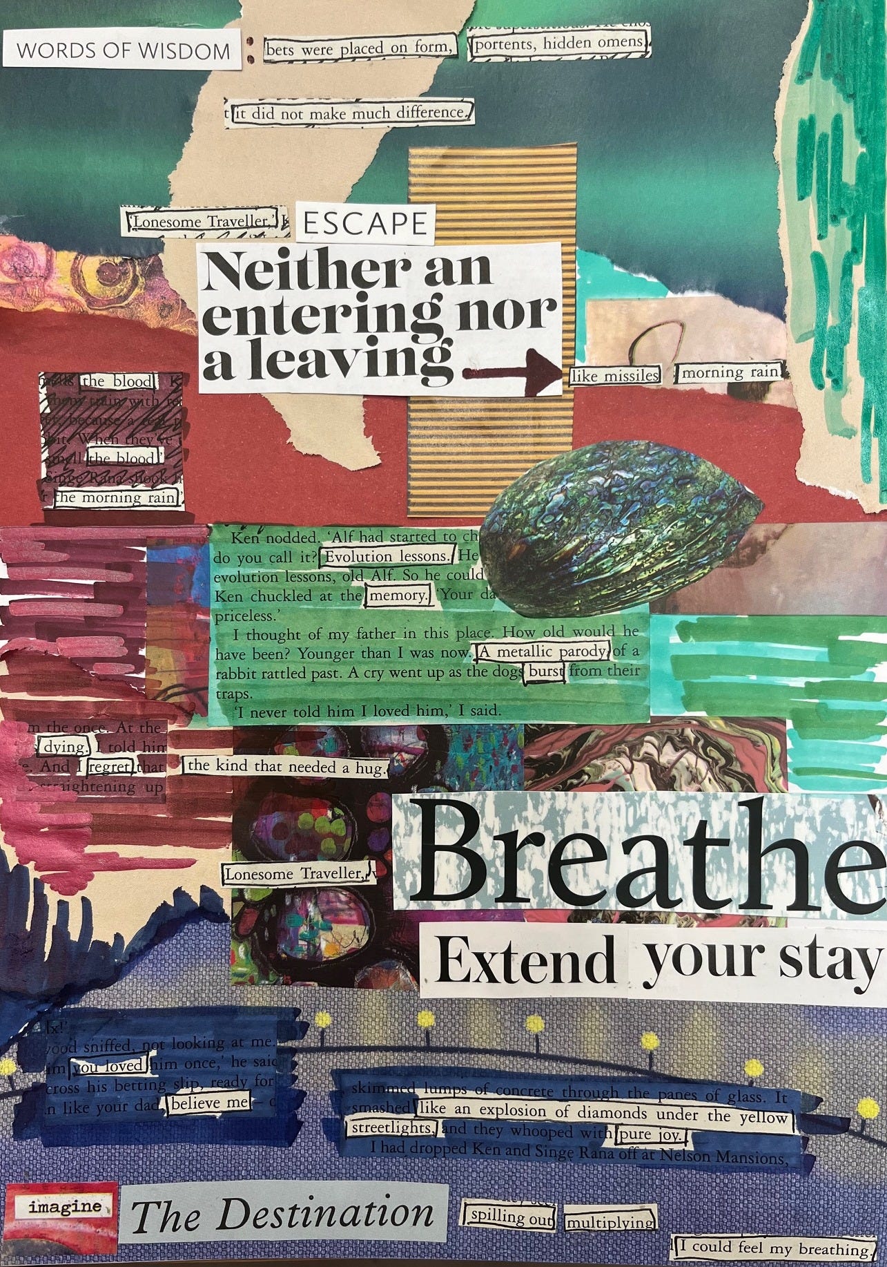 Last time we met, we spent the session focusing on a form of ‘found poetry’ where we selected words and phrases from a text to create a poem then developed this with collage to create a new visual and textual image. I loved this approach as it took some of the pressure of a blank page away from the act of creating. Instead, it was a process of finding, choosing, selecting, reordering; then cutting, moving, sticking, embellishing. It combined two of my favourite things - words and images – and was an empowering way of making new connections, physically taking hold of language and recrafting and reforming it in tangible ways to create something new. At the end of the session, we relished in the uniqueness of our individual creations and reflected on how relaxing and genuinely mindful the collaging process had been.